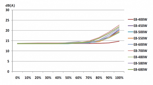 Do chłodzenia modeli z serii Dark Power Pro P9 wykorzystano również wentylatory Silent Wings. Poniższy wykres pokazuje poziom hałasu zależnie od obciążenia - dla najmocniejszego modelu, pracującego z pełnym obciążeniem wynosi on około 26 dBA.