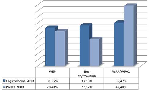 Sieć bezprzewodową można zabezpieczyć przy pomocy starego i mało praktycznego mechanizmu WEP, najskuteczniejszego WPA/WPA2 lub w ogóle nie zabezpieczać. Niestety, Częstochowa wypadła najgorzej ze wszystkich przebadanych do tej pory miast. W każdym z nich sposoby ochrony połączenia bezprzewodowego rozkładały się różnie, lecz WPA i WPA2 (czyli najskuteczniejsze metody zabezpieczenia sieci bezprzewodowej) stanowiły znaczną większość. Tutaj natomiast każdy sposób szyfrowania miał prawie taki sam udział. Jest to wynik bardzo zły.