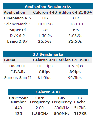 Benchmarki gier pozostają loterią, jednakże seria Celeron 400 bardzo zbliża się do Athlona 64 3500+.