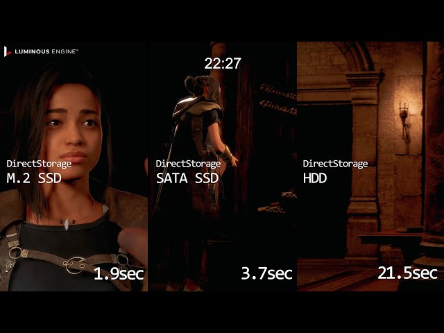 Studio Luminous Productions opublikowało materiał wideo, w którym chwali się zastosowanymi technologiami w silniku Luminous Engine (m.in. FidelityFX Super Resolution 2.0, Variable Shading, Denoising, Screen Space Reflections or Ambient Occlusion). Warto tutaj zwrócić uwagę właśnie na DirectStorage - na materiale porównano czas ładowania poziomów w grze Forspoken na przykładzie komputera z dyskiem HDD, zwykłym dyskiem SSD pod SATA i szybkim dyskiem SSD M.2 pod PCIe.