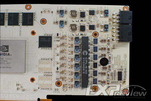 Galaxy GTX 460 dysponuje 8 fazami zasilania (6 dla procesora graficznego oraz 2 dla pamięci). Na płytce drukowanej widać 6 kości pamięci, tak więc prawdopodobnie do dyspozycji mamy 768 MB pamięci GDDR5 o szynie dostępu 192 bit - taktowania karty nie zostały podane. Do zasilania karty wymagane są dwie wtyczki – 6-pinowa oraz 8 pinowa (zwykła wersja wymaga dwóch 6-pinowych).