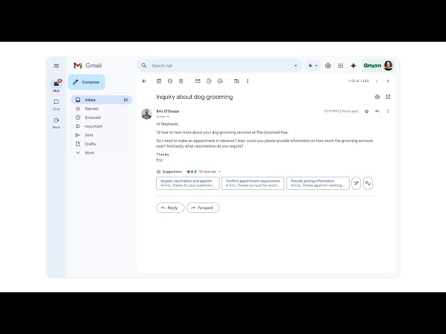 Funkcja Smart Replies wkrótce będzie w stanie uwzględnić osobisty kontekst. Gdy ktoś zada ci e-mailowo jakieś pytanie, Gemini będzie mógł przeanalizować dane z wcześniejszych wiadomości, notatnika Keep, Kalendarza, Dokumentów i innych aplikacji w poszukiwaniu odpowiedzi, a następnie wygenerować gotową wiadomość z uwzględnieniem stylu pisania użytkownika.