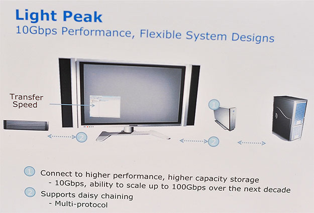 Na konferencji IDF 2010 zademonstrowano przesył danych wykorzystujący technologię Intel Light Peak. Te optyczne łącza oferują znacznie większą wydajność niż standard USB 3.0, umożliwiają także łączenie szeregowe urządzeń.