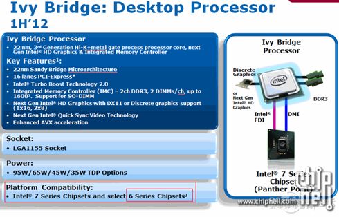 O nowych procesorach wiadomo już całkiem sporo. Tak więc Ivy Bridge będą najprawdopodobniej kompatybilne z obecnymi płytami głównymi z chipsetami P67 i H67. Dla uwiarygodnienia tej informacji prezentujemy nieoficjalny slajd, na który natrafiliśmy w internecie. Dodatkowo na na slajdzie znalazły się także informacje o kompatybilności nadchodzących procesorów również z przyszłymi chipsetami Intela 7 generacji (obecne są 6 generacji), które będą wymagane do wykorzystania zintegrowanego układu graficznego zgodnego z DirectX 11. Wykonane w 22 nm procesie technologicznym procesory zostaną wyposażone w natywną obsługę USB 3.0 oraz technologię Turbo Boost 2.0.