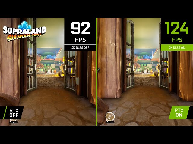 - Supraland: Six Inches Under – DLSS zwiększa wydajność rozgrywki nawet o 65%, umożliwiając wszystkim kartom graficznym GeForce RTX osiągnięcie ponad 60 kl./s w rozdzielczości 4K.