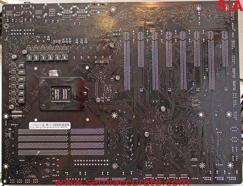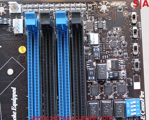 Potwierdzone z kolei zostały nasze przypuszczenia dotyczące konfiguracji portów PCI Express - cztery zgodne z trybem x16 oraz cztery zgodne z trybem x8. Warto podkreślić, że każdy z portów da się ręcznie włączyć lub wyłączyć, a służą do tego cztery małe przełączniki na dolnej krawędzi płyty. Obok nich umieszczono także cztery mini przełączniki DIP, które prawdopodobnie służą do regulacji napięcia zasilającego - niestety nie wiemy jakich podzespołów.