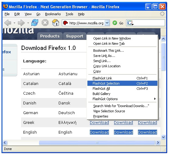 Rozszerzenie do przeglądarki Mozilla Firefox o nazwie FlashGot dodaje możliwość pobierania plików z internetu przy użyciu dodatkowych, nie wchodzących w skład tego programu tzw. "download managerów". Dzięki temu niejednokrotnie możemy zwiększyć prędkość ściągania.