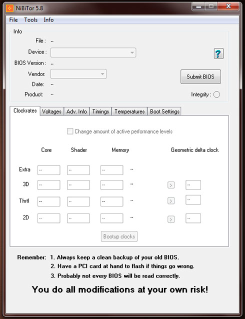Ta niewielka aplikacja umożliwi obeznanemu z tematem użytkownikowi na dość istotne modyfikacje BIOSu kart z serii GeForce - m.in. napięcia, zegary pamięci, GPU, itp. NiBiTor (bo tak w skrócie określa się aplikacje) umożliwia także dostęp do zaawansowanych parametrów i funkcji karty ukrytych w firmware układu.
