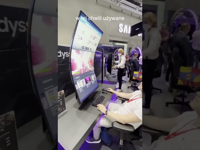Na kolejnym stanowisku zauważyliśmy dwa monitory, które już pokazywano nam w styczniu - 55-calowe Samsung Odyssey Ark. Okazuje się, że wbrew naszym pierwotnym domysłom, model ten jednak trafił do masowej produkcji i można go już realnie zamówić (za 13,5 tysiąca złotych...). Przypominamy, że jest to zakrzywiony panel VA z podświetleniem mini LED. Od zwykłego monitora wyróżnia go przede wszystkim obecność zewnętrznej skrzynki z elektroniką oraz złączami wideo (4x HDMI 2.1 + 1x DisplayPort 1.4a).