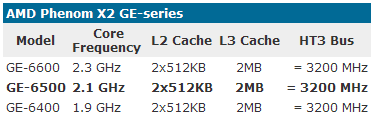 Phoenm X2 GE-6600 taktowany jest z częstotliwością 2.3 GHz. Zupełnie przypadkiem Intel Core 2 Duo E6600 taktowany jest z częstotliwością 2.4 GHz. Środek oferty opartej na procesorze Phenom X2 serii GE stanowi Phenom X2 GE-6500 taktowany z częstotliwością 2.1 GHz. Natomiast na samym końcu oferty znajdziemy Phenoma X2 GE-6400, którego rdzeń taktowany jest z częstotliwością 1.9 GHz.