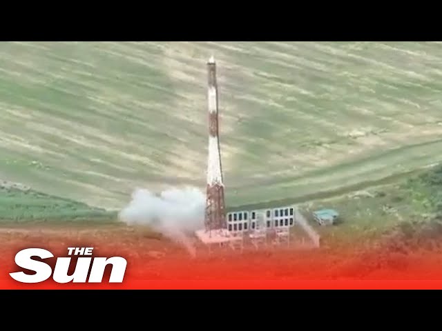 Na nagraniu można zauważyć niedużą eksplozję przy jednej z podstaw wieży - to właśnie w tym momencie miało nastąpić uderzenia drona kamikadze (chociaż na nagraniu go nie widać). Kilka sekund później konstrukcja się przechyla i przewraca.