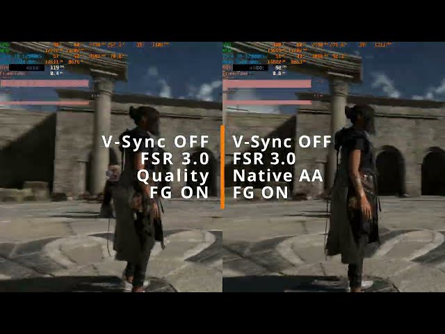 Porównanie działania FSR 3.0 Frame Generation z aktywnym V-Sync i bez niego (Forspoken)