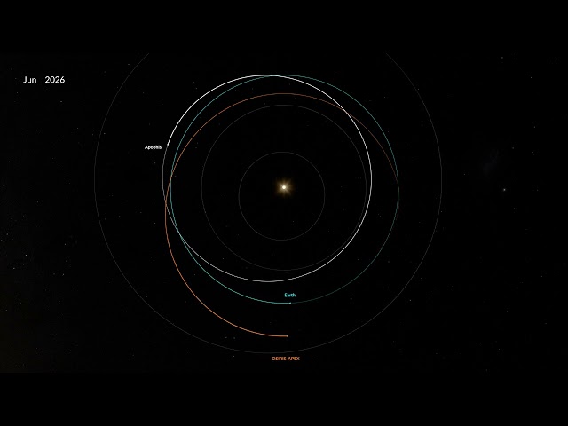 Misja DART pokazała, że możemy wpływać na orbity potencjalnie niebezpiecznych obiektów, ale nie jest to proste. Szczególnie niebezpieczne są asteroidy o strukturze hałdy gruzu. W październiku rusza misja HERA, która dokładnie oceni, co zdołaliśmy zrobić układowi asteroid Didymos-Dimorfos w 2022 r., uderzając w jedną z nich sondą-pociskiem DART. Misja OSIRIS-APEX goni z kolei asteroidę Apophis o rozmiarze około 340 metrów, która jeszcze niedawno była na liście obiektów o niezerowym prawdopodobieństwie zderzenia się z Ziemią w XXI wieku. Poniżej wizualizacja tej pogoni, która zakończy się w 2029 roku.