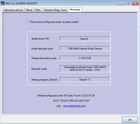 Ostatnie już okno to "informacje" dotyczące zastosowanej karty dźwiękowej oraz sterownika. Karta wyposażona jest w silnik XEAR 3D EAX.