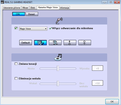 Kolejna zakładka "karaoke lub inaczej magic voice" pozwala na zmianę ustawień mikrofonu, tak aby lepiej działał z aplikacjami do karaoke. W związku z tym nie mogło zabraknąć opcji do modyfikacji głosu na np. głos kobiety a nawet postaci z komiksu. Dodatkowe ciekawe opcje to wyciszanie wokalu w utworach oraz zmiana tonacji.