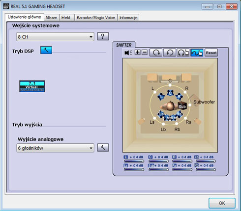 Następną opcją jest tryb DSP, który pozwala na uruchomienie efektu procesora DSP 7.1 Virtual Speaker Shifter. Dzięki niemu w ustawieniach zaawansowanych możemy np. przybliżać i oddalać poszczególne głośniki, które znajduje się w środku wirtualnego pomieszczenia. Jest to funkcja przeznaczona dla bardziej wymagających i zaawansowanych użytkowników. Tryb wyjścia pozwala na wybranie analogowego wyjścia dźwięku oraz ustawienie opcji dodatkowych z nim związanych. Do wyboru mamy takie ustawienia jak: słuchawki, 2 głośniki, 4 głośniki, oraz 6 głośników. Po wybraniu opcji 6 głośników pojawiają się opcje wzmocnienia niskich częstotliwości (trzy poziomy) oraz zmiany wyjścia centralnego z subwooferem.