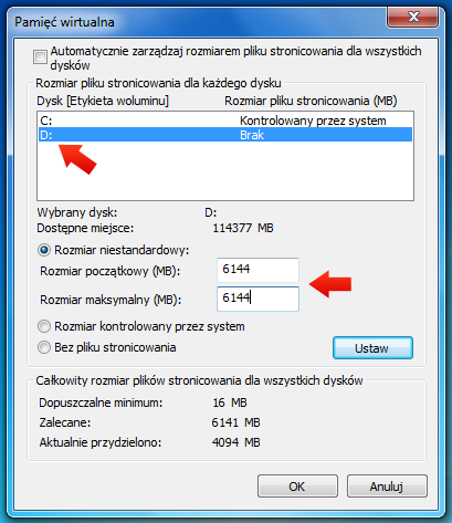 Po dokonaniu wyboru przechodzimy niżej i klikamy opcję „Rozmiar niestandardowy”. Wartość jaką tam wpiszemy będzie wielkością pamięci wirtualnej. Jej zalecana objętość powinna stanowić półtorakrotność fizycznej pamięci RAM. Jeśli więc mamy zainstalowane 4GB RAM, czyli 4096 MB w polach „Rozmiar początkowy” oraz „Rozmiar maksymalny” wpisujemy 6144MB. Najkorzystniej jest gdy obie wartości są takie same, gdyż wtedy pamięć wirtualna podlega mniejszej fragmentacji. Jej wielkość nie zmienia się, bo cały czas zarezerwowany ma ten sam obszar na dysku.