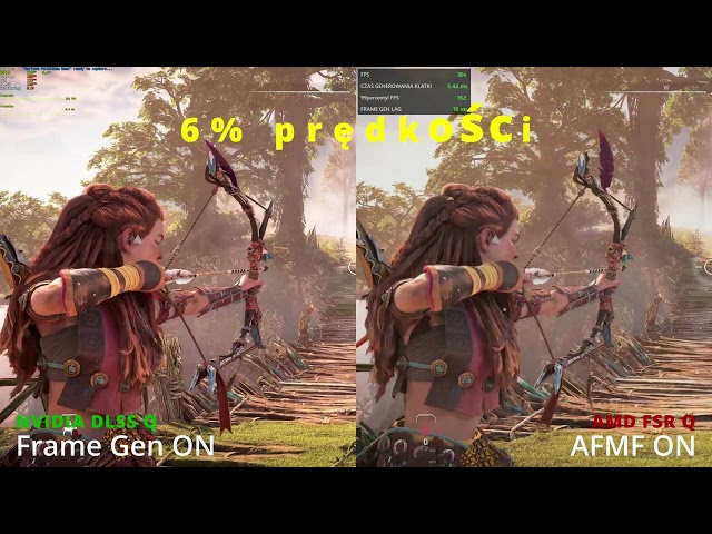 Twórcy gry przygotowali niesamowicie szczegółowe animacje walki, zarówno dla Aloy, jak i dla maszyn oraz ludzkich przeciwników. Gra jest wyjątkowo dynamiczna i na ekranie co chwilę coś się dzieje albo wybucha (oczywiście podczas walki). W takich warunkach nawet zdegenerowane przez konsole oko naszego redakcyjnego kolegi Macieja bez problemu wyłapie różnice pomiędzy 60 FPS a 120 FPS i wyżej (tylko po to, aby ponarzekać, że jest zbyt płynnie :P). Faktem jest, że generowanie klatek (tak przez DLSS, jak i AFMF) nie sprawia, że gra szybciej reaguje na nasze polecenia – opóźnienie w reakcji jest w najlepszym przypadku takie samo, jak bez aktywacji generatora. Niemniej wizualnie znacznie płynniejsza animacja zdecydowanie poprawia komfort z rozgrywki – zakładając oczywiście, że bazowo mamy przynajmniej te 60-80 FPS (tyle w naszej opinii wystarczy, aby opóźnienia nie przeszkadzały w grze). A co z kwestią jakości obrazu, czyli tym jak wyglądają generowane klatki? Tutaj również mamy dla Was film:
