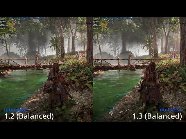 Latające obiekty w przypadku FSR też czasami ulegają rozmazaniu, ale zwykle po prostu są mniej widoczne. Dodatkowo FSR znacznie gorzej radzi sobie z odbiciami w wodzie i w naszym odczuciu za bardzo wyostrza roślinność sprawiając, że ta wygląda, jakby nie została w ogóle poddana antyaliasingowi. Ogólnie dla posiadaczy kart Radeon oraz starszych GeForce (GTX) nadal FSR będzie lepszym wyborem od XeSS, z którym obecnie gra jest dostępna, ale stanowczo nie jest to ta sama jakość obrazu, co DLSS. Jest jednak pewna rzecz, jaką ci użytkownicy mogli zrobić, aby nieco poprawić jakość upscalingu – otóż jeszcze przed aktualizacja 1.3.55.0 samej gry Intel wypuścił nowa wersję bibliotek XeSS – 1.3. Podmiana pliku .dll (za pomocą której mogliśmy jeszcze przed najnowszą łatką aktywować XeSS 1.3) pozwala prawie całkiem pozbyć się smużenia (mniej więcej do poziomu FSR 2.2), ale przy tym cała reszta obrazu prezentuje się lepiej niż na FSR, w szczególności właśnie odbicia na wodzie. Zobaczcie sami na kolejnym filmie: