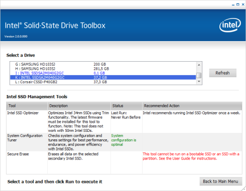 Polecam również skorzystać z aplikacji Intel® Solid State Drive Toolbox(obecnie w wersji 2.0). Pozwala ona utrzymywać dysk w jak najlepszym stanie optymalizując nasz nośnik- chodzi tutaj głównie o zastosowanie funkcji TRIM i fizyczne wykasowanie wszystkich komórek pamięci oznaczonych przez system jako skasowane. Intel zaleca cotygodniowe stosowanie tego programu, aby nasz dysk SSD nie zaznał spadku wydajności.