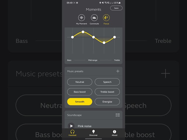 Aplikacja Jabra jest raczej lubiana, bo działa dobrze i nie ma zbędnych bajerów. Przede wszystkim dostajemy regulację ANC oraz funkcji przekazywania zewnętrznych dźwięków. Jest też oczywiście opcja wyłączenia ANC. Można bez problemu wybrać fabryczne ustawienia korektora dźwięku lub dopasować je ręcznie.