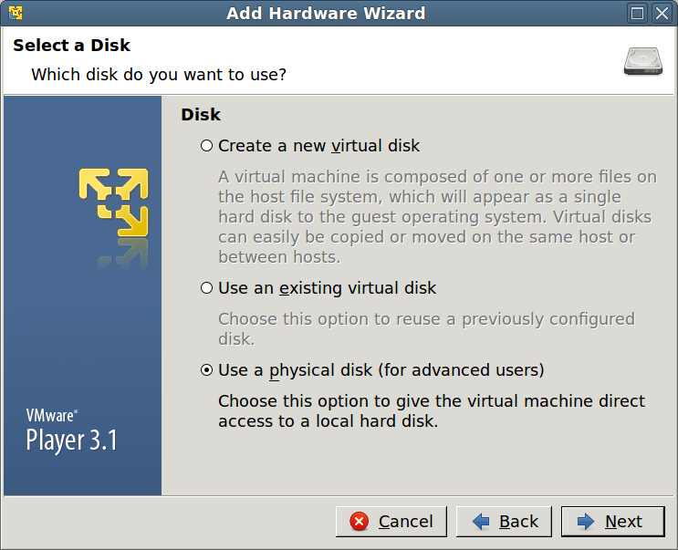 Inną ciekawą opcją jest funkcja wykorzystania fizycznego dysku czy też jego partycji. W tym celu przy dodawaniu nowego dysku do maszyny (np. poprzez przycisk Add w jej ustawieniach) w kreatorze należy wybrać trzecią dostępną opcję (Use a physical disk).