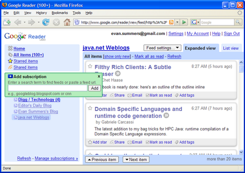 Google Reader pozwala na dodawanie kanałów i grupowanie ich według treści lub rodzaju źródła. Ponadto możemy dzielić się z innymi swoimi listami subskrypcji. Pobrane treści prezentowane są w bardzo łatwy do przeglądania sposób. Aplikacja posiada też zapisane wiele najpopularniejszych stron, które możemy od razu dorzucić do obserwowanych. Dostępna jest również mobilna wersja witryny dla telefonów komórkowych.