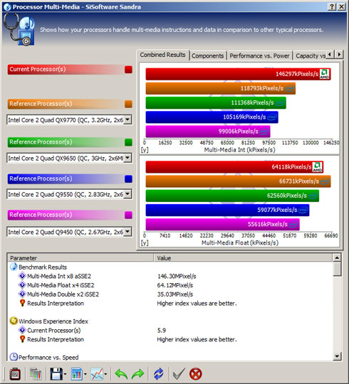 SiSoft Sandra to prawdziwy kombajn służący do testowania różnych podzespołów komputera. W tym teście wykorzystamy dwa zestawy benchmarków - Procesor Arithmetic oraz Procesor Multi-Media Benchmark. Oba dają dwa zestawy wyników, osobno dla ALU i FPU.