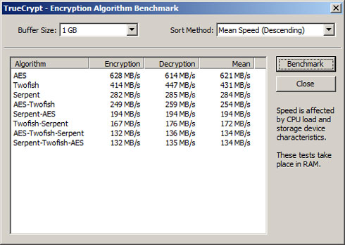 TrueCrypt jest programem służącym do szyfrowania danych. Specjalnie na Waszą prośbę dodajemy go do naszego zestawu aplikacji testowych. Program ma wbudowanych benchmark, który w naszym przypadku wykonywany był na pliku o wielkości 1GB. Podajemy tylko wartość średnią (Mean) dla pierwszych trzech algorytmów szyfrowania: AES, Twofish oraz Serpent. Wynik podawany jest w MB/s, im więcej tym lepiej.