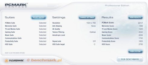 PCMark Vantage to kolejna aplikacja ze stajni Futuremark, program testuje ogólną wydajność komputera symulując pracę normalnych aplikacji. Na potrzeby testu podamy wszystkie wyniki cząstkowe poszczególnych testów bez zagłębiania się się w ich składowe.