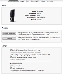 • Można włączyć opcję czytania wybranego elementu menu (menu głosowe). Wymaga to jednorazowego podpięcia odtwarzacza do programu iTunes i zaznaczenia opcji „Włącz menu głosowe” w polu „komunikaty głosowe”. W podobny sposób włączyć można także funkcję VoiceOver, która przeczyta dla nas nazwę aktualnie odtwarzanego utworu i artysty.
