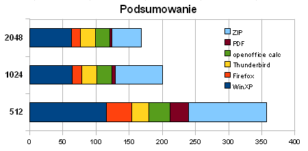 Komprezja ZIP. Tutaj przewagę ma system z 2GB RAM, później 1GB, 512 MB daleko z tyłu. Plik wymiany bez znaczenia, z wyjątkiem oczywiście 512 MB RAM.
