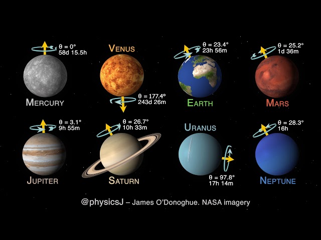 Natomiast oś obrotu Urana jest nachylona pod kątem 97,77 stopnia, czyli znajduje się prawie w płaszczyźnie orbity. Wynikiem takiego nachylenia jest odwrotny niż w przypadku innych planet (z wyjątkiem Wenus) kierunek ruchu obrotowego. Poniżej ciekawa wizualizacja, z zaznaczonym nachylenie osi obrotowej i animacją szybkości wirowania dla wszystkich planet i Plutona.